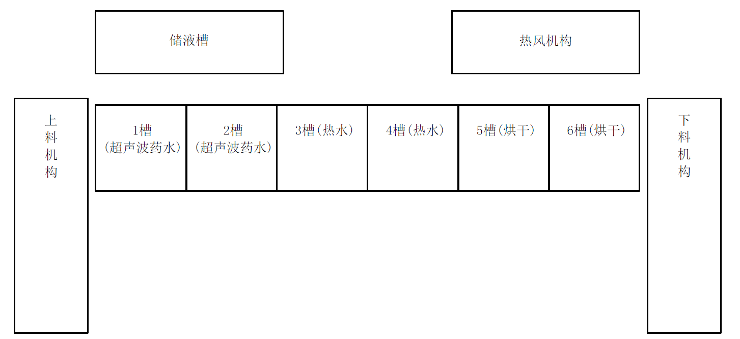 上料→NO.1超声波、清洗剂、鼓泡粗洗→NO.2超声波、清洗剂、鼓泡精洗→NO.3鼓泡溢流漂洗